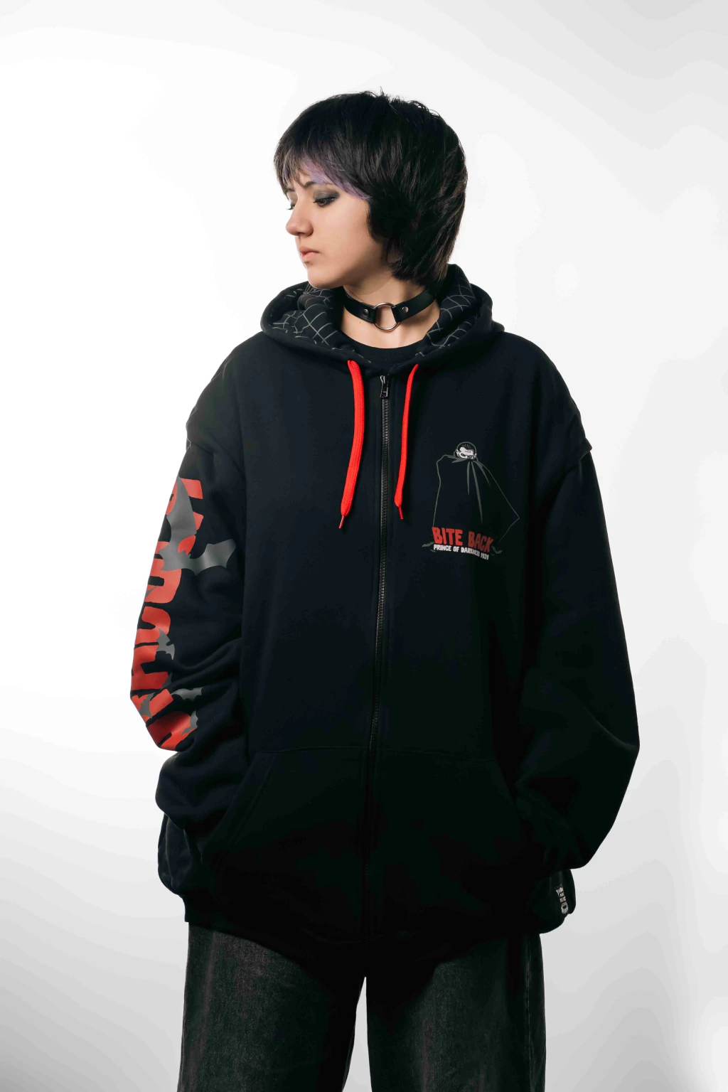 Sumergite en el misterio del cine clásico con la Campera Bite Back Drácula, inspirada en la icónica película de 1931 con Bela Lugosi. Esta prenda exclusiva combina un diseño único con estampados en serigrafía al frente, espalda, mangas y el interior de la capucha, acompañados por un forro de jersey estampado que realza su carácter oscuro y elegante.