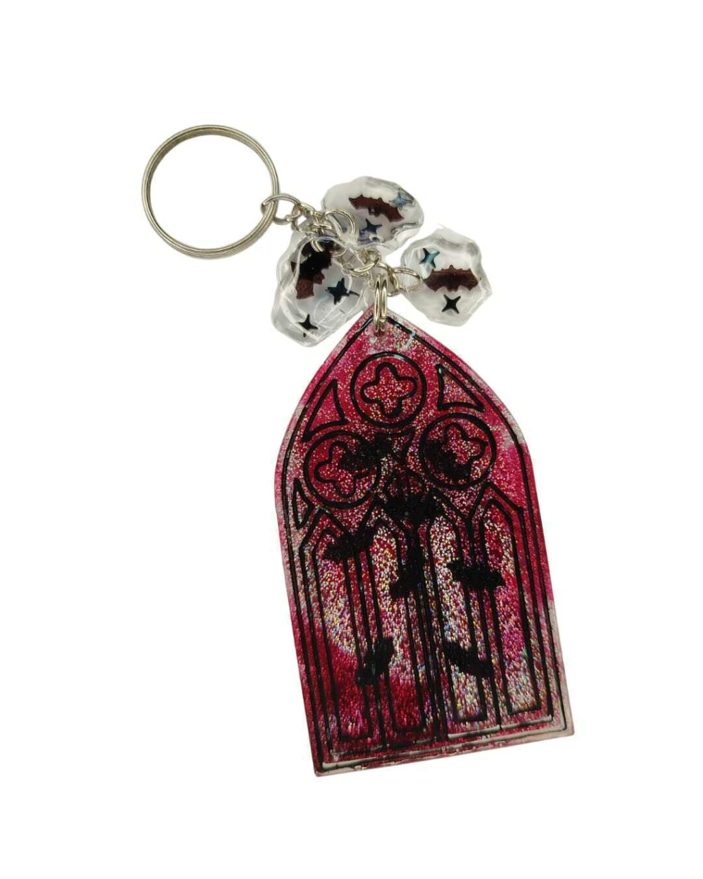 Descubrí la elegancia oscura del Llavero Gotic Vitreaux, una pieza única inspirada en los antiguos vitrales góticos. Cada detalle está cuidadosamente elaborado a mano por Panther Desing, utilizando resina transparente que resalta sus colores vibrantes y pequeños colgantes de murciélagos que le dan un toque misterioso y encantador.