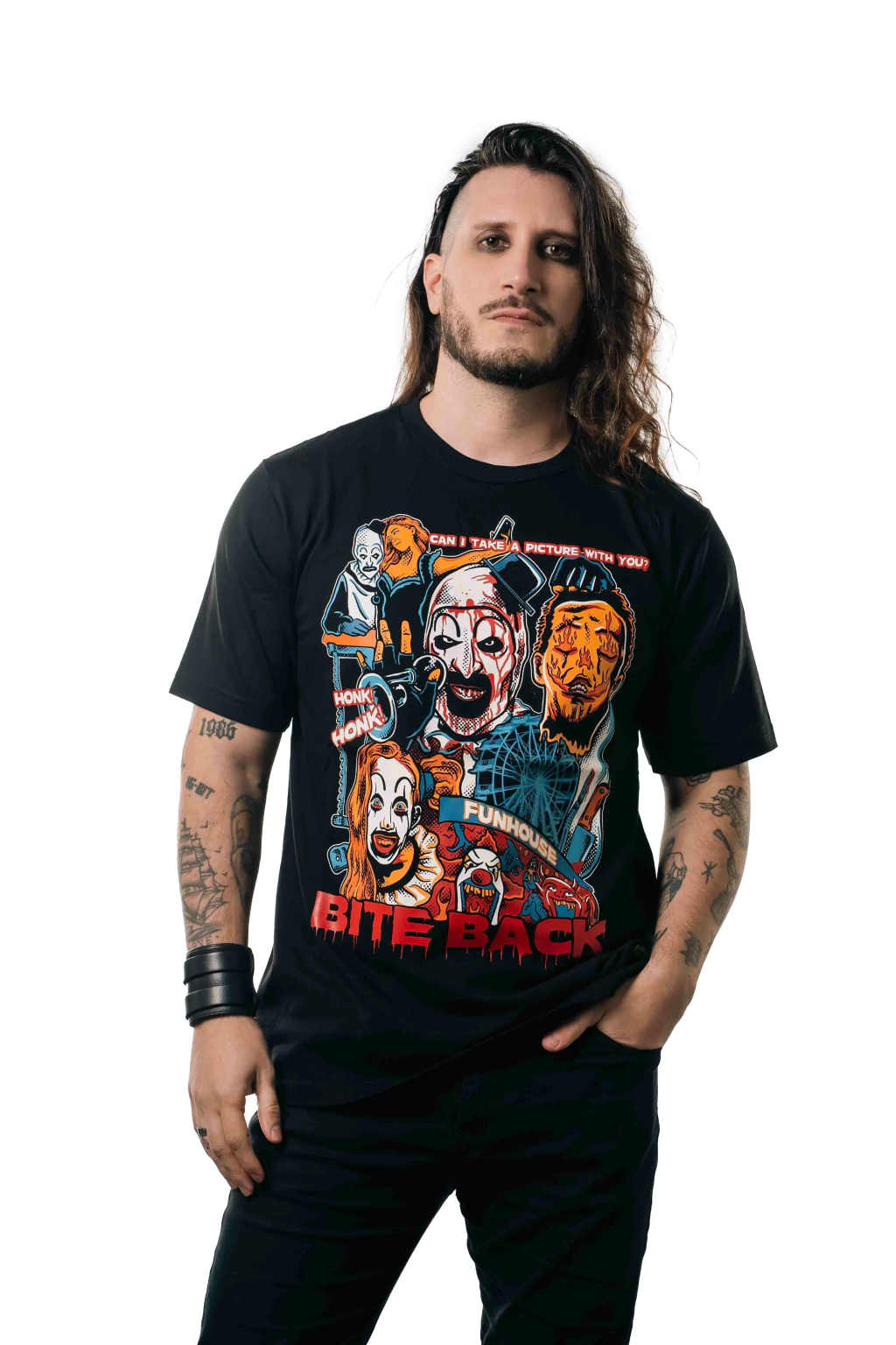 Compra ahora y añade la Remera Bite Back Terrifier a tu colección de ropa de terror.
