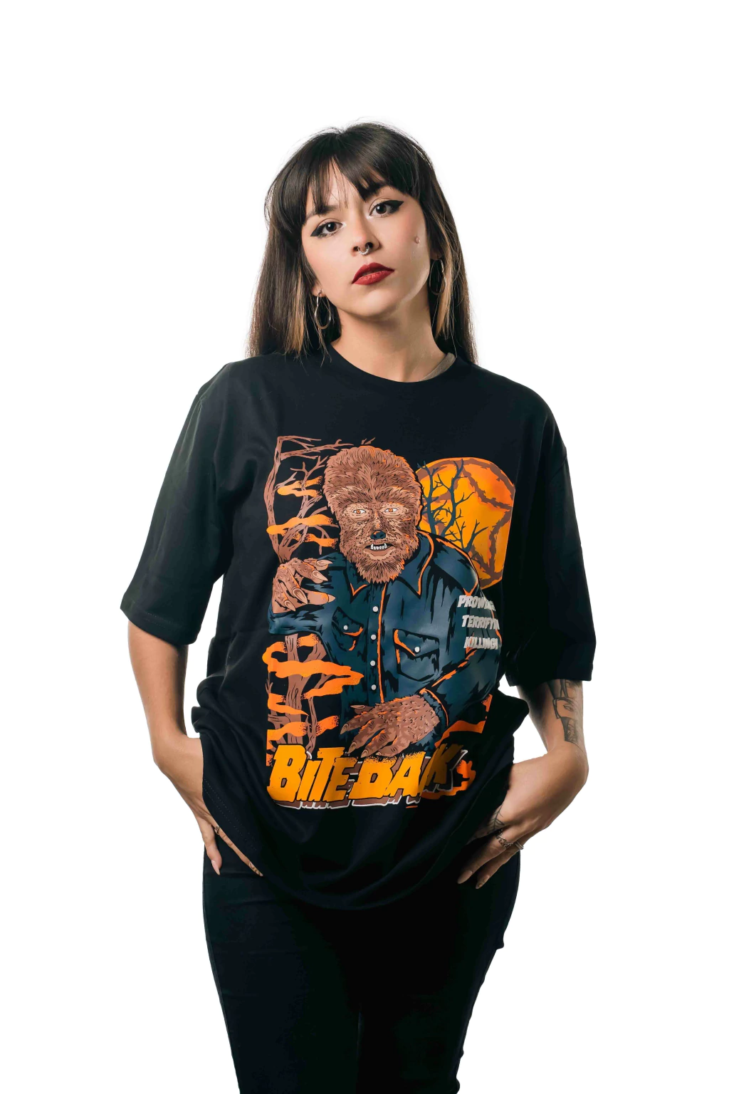 Compra ahora y añade la Remera Bite Back Wolfman a tu colección de ropa de terror.